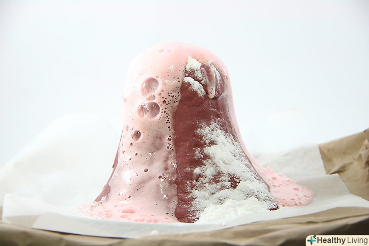 Залийте оцтову суміш в ємність для лави. з лійкою буде, до речі кажучи, куди простіше.- Візьміть харчову соду. Візьміть серветку, покладіть туди соду, поверніть серветку на манер мішечка і перетягніть чимось на зразок гумки.