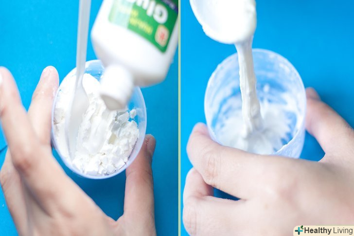 Додайте невелику кількість клею в крохмаль, повільно помішуючи. продовжуйте додавати клей, поки суміш не стане потрібної консистенції. Зазвичай на одну частину клею припадає дві частини крохмалю.- В суміші не повинно бути грудок. Якщо вони є, додайте ще клею.