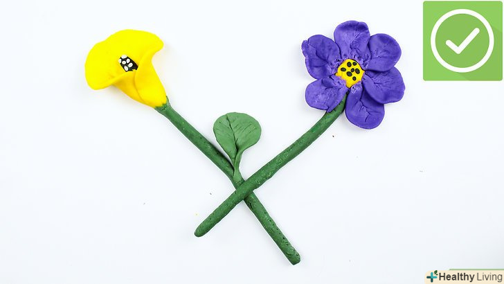 - Відокремлюючи невеликі шматочки пофарбованої глини, пальцями і/або гострим ножем надайте їм форму частин квітки. скористайтеся виделкою або спеціальною стекою, щоб сформувати реалістичну серцевину квітки. Зробіть в ній поглиблення, і нехай вона буде трохи більше в окружності – до неї будуть кріпитися пелюстки. Потім сформуйте для кожної квітки стебло і міцно прикріпіть.