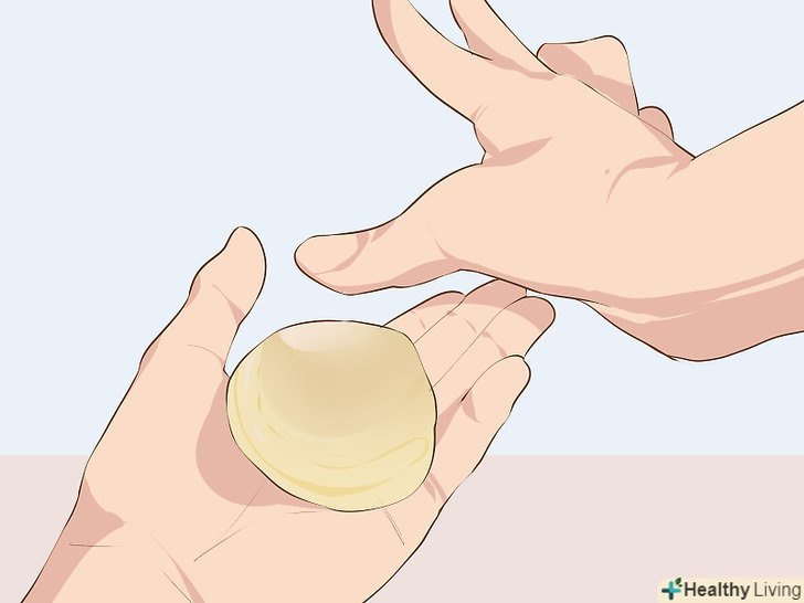 Розкачайте глину руками. коли глина стане м'якше, скачайте з неї ковбаску, а потім сформуйте кульку. Коли ви розгортаєте глину, виникає тертя, яке теж допомагає пом'якшити матеріал. [3]- Також глину можна попередньо нарізати на невеликі шматки, після чого розім'яти.