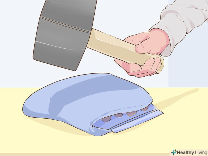 Відбийте глину гумовою киянкою. Якщо глина тверда настільки, що неможливо використовувати качалку, вам буде потрібно докласти до неї ще більше сили. Розділіть глину на дрібні шматки (які тільки вийде), а потім складіть їх в пакет з зіп-застібкою. Оберніть пакет тканиною і покладіть на підлогу або на тротуар або зацементовану поверхню на вулиці. [4]- За допомогою гумової киянки відбивайте глину протягом декількох хвилин. Удари киянки допоможуть розбити глину на більш дрібні частини і створять в ній додаткове тертя, яке зробить матеріал м'якше.