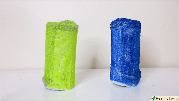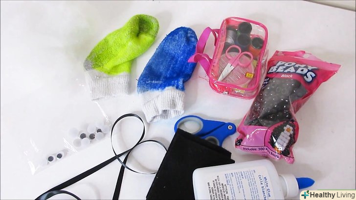 Придбайте дві пари шкарпеток. Вам буде потрібно один носок яскраво-жовтого кольору (кольору банана), а також один носок синього кольору.- Знайдіть місце розташування п'яти на жовтому шкарпетці і розріжте його в цьому місці. для виготовлення тіла міньйону вам буде потрібно Нижня (носова) частина носка. Верхню частину носка збережіть для подальшого виготовлення рук.