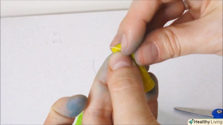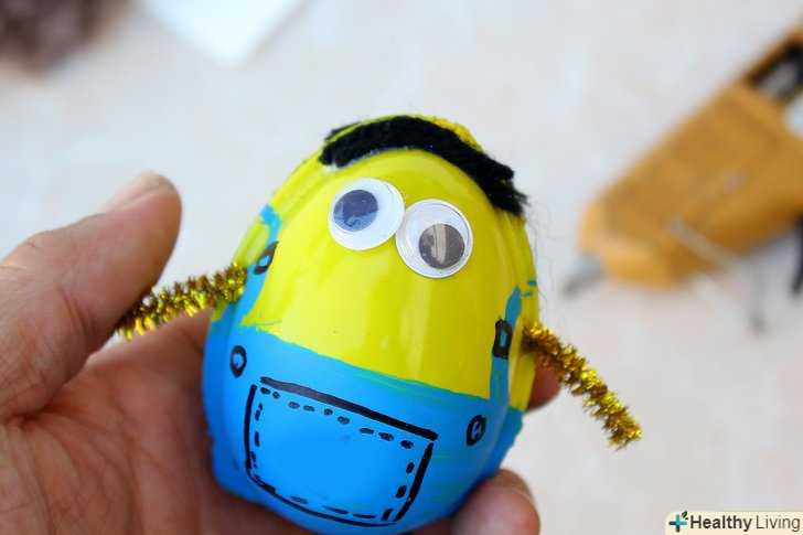 - Для імітації волосся приклейте до верхівки голови трохи пряжі або шматочки йоржика для прочищення трубок. якщо ви хочете зробити так, щоб волосся міньйона стирчали стирчком, наріжте йоржик для трубок на шматочки по 2,5 см і застроміть їх в голову міньйона. Якщо голова насилу протикається, то можна попередньо проколоти в ній отвори за допомогою зубочистки.