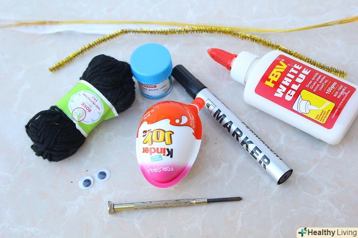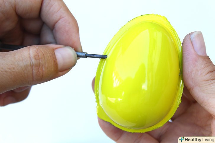 Знайдіть контейнер від Kinder сюрпризу. Kinder Сюрприз можна придбати практично в будь-якому продуктовому магазині. Також ви можете використовувати будь-яке інше аналогічне яйце з сюрпризом всередині або пластикові великодні яйця (але їх буде важче продірявити). Ще можна взяти якусь іграшку або упаковку яйцеподібної форми. Просто пофарбуйте використовувані деталі в жовтий колір і склейте.- Склейте контейнер. Відкрийте контейнер і нанесіть по краю тонкий шар суперклею. Закрийте контейнер і дайте клею застигнути. Так ваш міньйон прослужить вам довше.