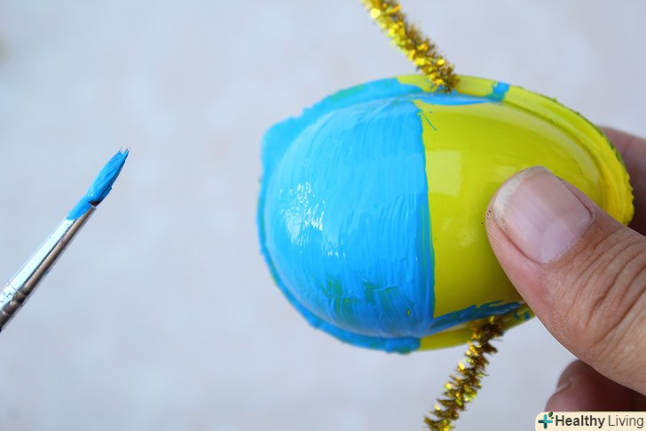 - Фарбуйте верхню половину міньйону в жовтий колір, а нижню – в синій, і дозвольте фарбі висохнути. Жовта частина буде являти собою тіло міньйона, а синя – його Спецодяг.
