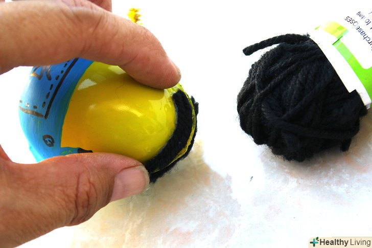 Зробіть волосся. наріжте невеликі шматочки чорної пряжі і приклейте їх клеєм до верхньої частини голови міньйон.