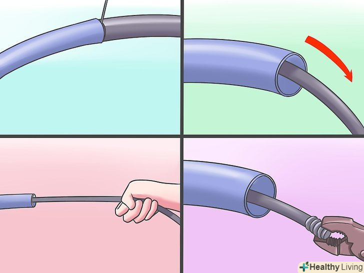 Вставте всередину обруча трос-гумку, щоб зробити його складним. нижче описані всі етапи даної операції.- Скористайтеся 20-сантиметровим відрізком міцної сталевого дроту (наприклад, від дротяної Вішалки). Закріпіть його на кінці троса-гумки і вставте в один з кінців розімкнутого в одному місці обруча.