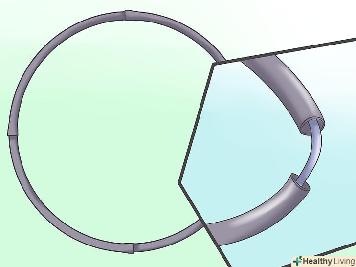 З'ясуйте, скільки труби вам необхідно і поділіть її довжину на чотири рівні частини. щоб визначити необхідну для обруча довжину тонкої труби, призначеної для систем зрошення, станьте прямо і виміряйте відстань від підлоги до торсу (на рівні десь між пупком і грудьми). Ця мірка буде відповідати діаметру стартового обруча для занять, якщо у вас нормальний індекс маси тіла. У разі надмірної ваги або ожиріння розрахувати ідеальний діаметр обруча можна, помноживши обхват вашої талії на 1,2 (наприклад, 100 см х 1,2 = 120 см). Далі потрібно обчислити окружність обруча, щоб з'ясувати довжину труби для його виготовлення. Довжина кола (L) дорівнює числу π (3,14), помноженому на діаметр (d): L=π*d.- В середньому, діаметр обруча для дорослої людини дорівнює 100 см, тому довжина його кола становить 314 см. в такому випадку довжина кожної деталі буде дорівнює 78,5 см.