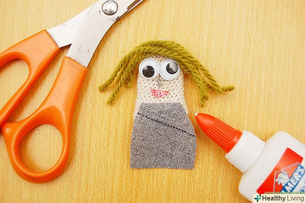 - Додайте волосся. Використовуйте пряжу, шерсть, нитки для того, щоб зробити волосся. Волосся можуть бути розпущені, зібрані в хвіст, заплетені в косу, бути довгими або короткими. Бороду модно зробити зі шматочків вати або вовни. Приклейте або пришийте волосся і бороду.