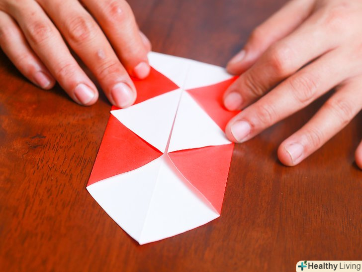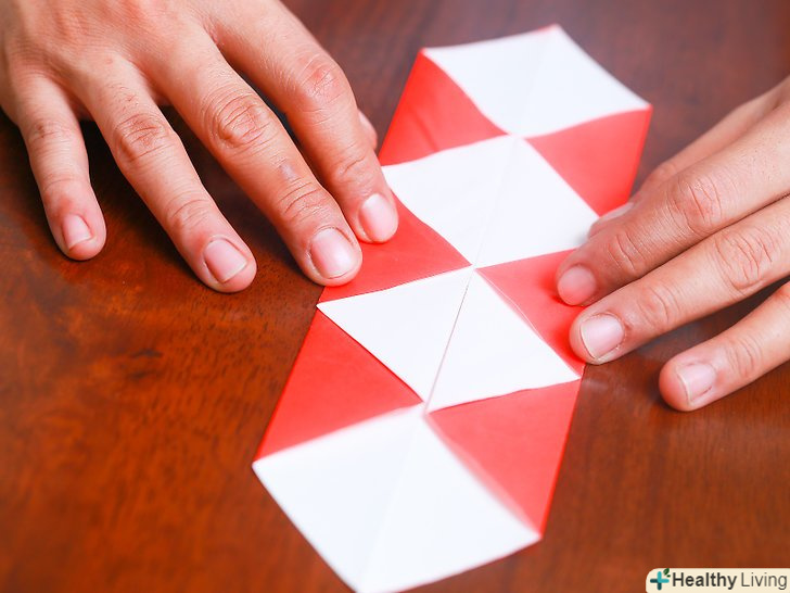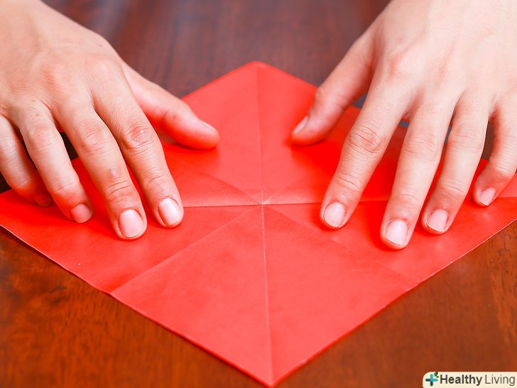 Зігніть ці краї до центру. після згинання сторін, перевернуті краї будуть стирчати. Зігніть їх до центру, розгладивши бічні складки. [11]- В результаті у вас повинні вийти чотири ромба, оточені трикутниками, спрямовані всередину.
