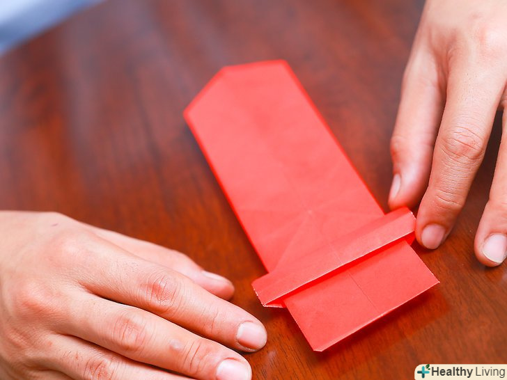 Зробіть ще одну опуклість. Подивіться на малий ромб над рукояткою. Зробіть горизонтальний згин назовні у верхній частині ромба і горизонтальний згин всередину посередині. За допомогою складання необхідно зробити ще один шар над рукояткою, щоб нижня частина складки збіглася з верхньою частиною рукоятки. Розгладьте складки. [18]