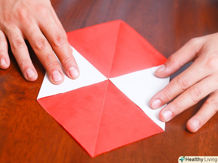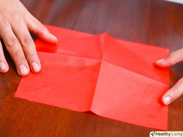 Складіть папір навпіл по діагоналі. прикладіть лівий верхній кут листа до правого нижнього, тим самим створюючи діагональну складку. Розгорніть лист. [5]