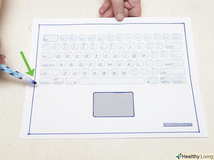 - Якщо ви хочете домогтися бездоганного вигляду, саму клавіатуру можна теж роздрукувати, а не малювати від руки. Тільки дивіться, щоб за розміром вона відповідала іншим частинам ноутбука. [6]