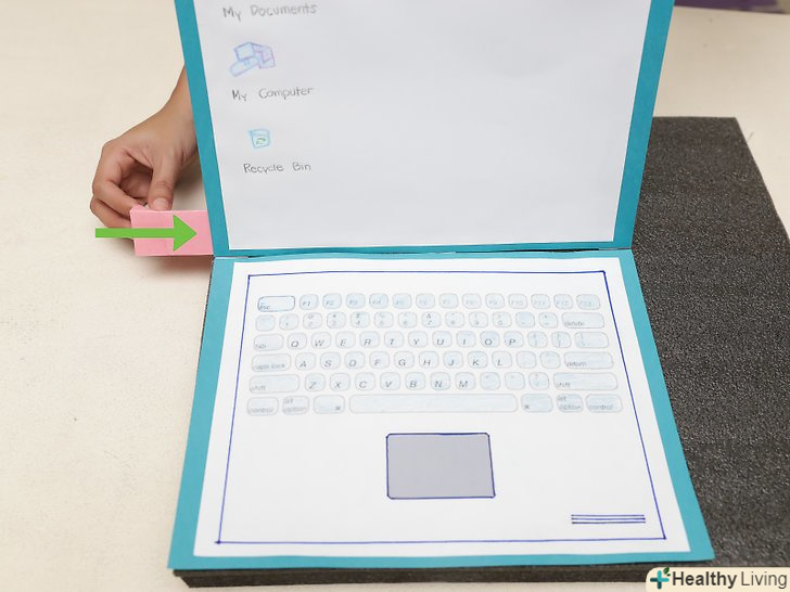 - Якщо ви хочете зробити ноутбук трохи міцніше, можете зміцнити його картоном. Приклейте по шматку картону до верхньої і нижньої половинок ноутбука. Потім наклейте ще по одному листку кольорового або візерунчастого паперу зі зворотного боку картону, щоб він не просвічував. Після цього наклейте робочий стіл і клавіатуру. [9]