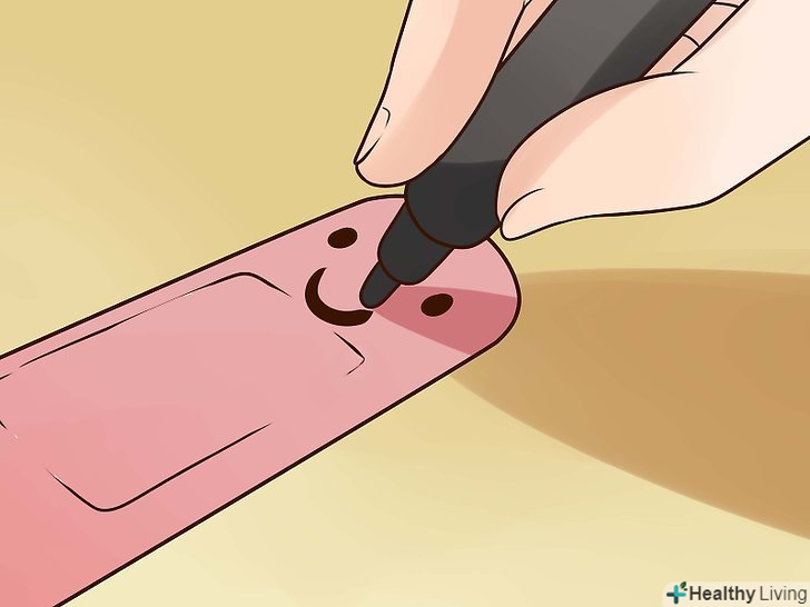 Прикрасьте смужки пластиру. Перетворіть звичайний пластир в симпатичну маленьку річ, яка повеселить вашого друга. Перманентним маркером намалюйте смішне личко-смайлик по центру кожної смужки. Можете зробити його веселим і усміхненим або понурим і незадоволеним, в залежності від вашої задумки. Постарайтеся зробити їх все різними.- Якщо у вас є" бігають " очі з пластика, використовуйте їх. Якщо ні, просто намалюйте очі перманентним маркером. [3]
