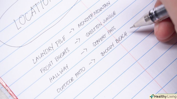 Доповніть чотири-п'ять домашніх орієнтирів відповідними чотирма-п'ятьма піратськими картинками. якщо ви вирішили влаштувати пошуки скарбів будинку, можна використовувати в якості орієнтирів диван, лампу, мікрохвильову піч, холодильник і підібрати для них відповідні картинки. Для вуличного полювання за скарбами можна зробити орієнтирами велике дерево, батут, гойдалки, кущ троянд і великий камінь. Потім необхідно буде подумати про те, як творчо позначити ці предмети на карті. Наприклад, ванну можна зробити "водоспадом долі", а великий вуличний камінь — "Островом черепа". Нижче наведено інші цікаві приклади:- "Гора монстрів" - купа брудної білизни для прання;