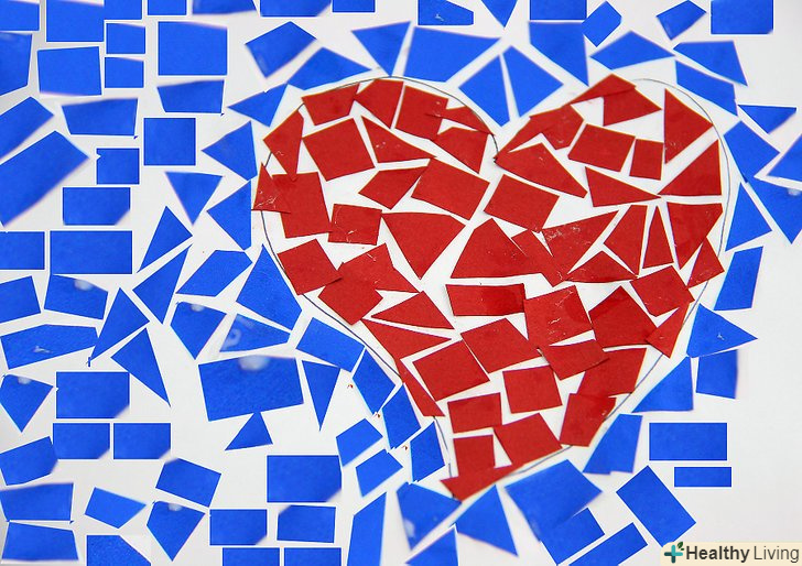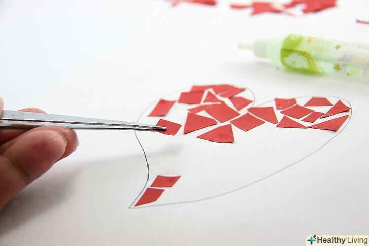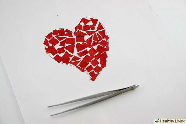 Приклейте вирізані шматочки паперу на намальовані зображення на аркуші. залиште невеликий проміжок між кожним вирізаним шматочком, щоб створити ефект мозаїки. Вони повинні знаходитися досить близько один від одного, деякі можуть навіть перетинатися.