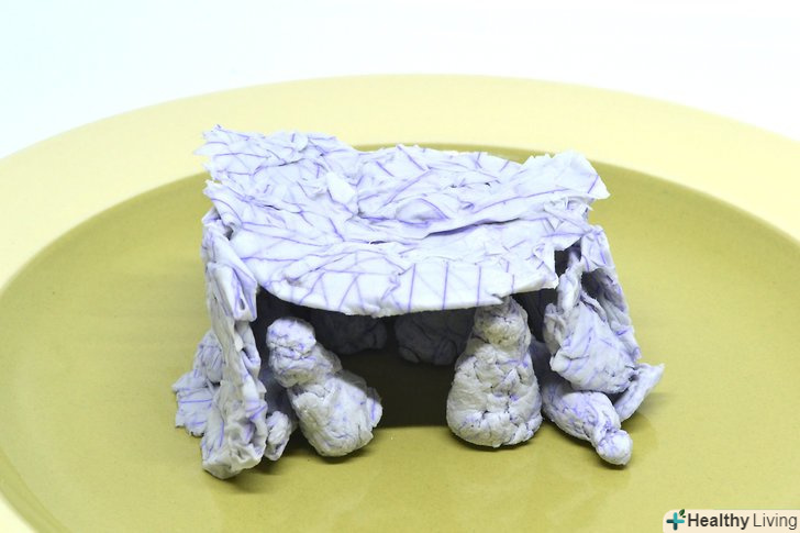 Покладіть паперову ковбаску на тарілку або піднос. Вам необхідний піддон, щоб потім готовий будиночок можна було без проблем виставити сушитися на сонці. Зробіть всього 3 ковбаски з мокрих грудок паперу. Розкладіть їх по квадрату, у якого поки не вистачає однієї зі сторін. [12]