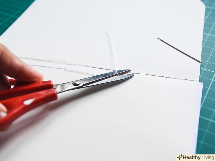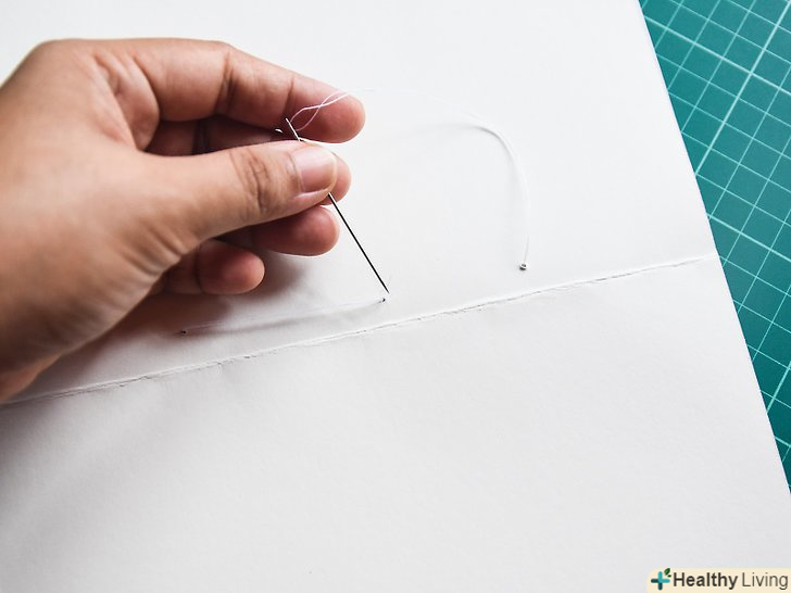 Зшийте книгу. проведіть голку через верхній отвір із зовнішнього боку корінця. Залиште стирчати зовні хвостик нитки довжиною близько 10 см.прошийте листи аж до нижнього отвору, а потім поверніться назад вгору. Коли виведете голку з центрального отвору, зупиніться. [9]