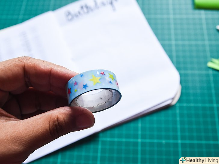Якщо захочете, обклейте корінець книги декоративним скотчем. обріжте кінчики вощеної нитки якомога ближче до вузла. Потім візьміть відрізок кольорового декоративного скотча довжиною 21 см.оберніть їм корінець книги, щоб приховати нитки. Замість скотча також можна наклеїти кольорову стрічку.- Декоративний скотч часто має барвистий візерунок. Знайти його можна у відділі скрапбукінгу в товарах для рукоділля.