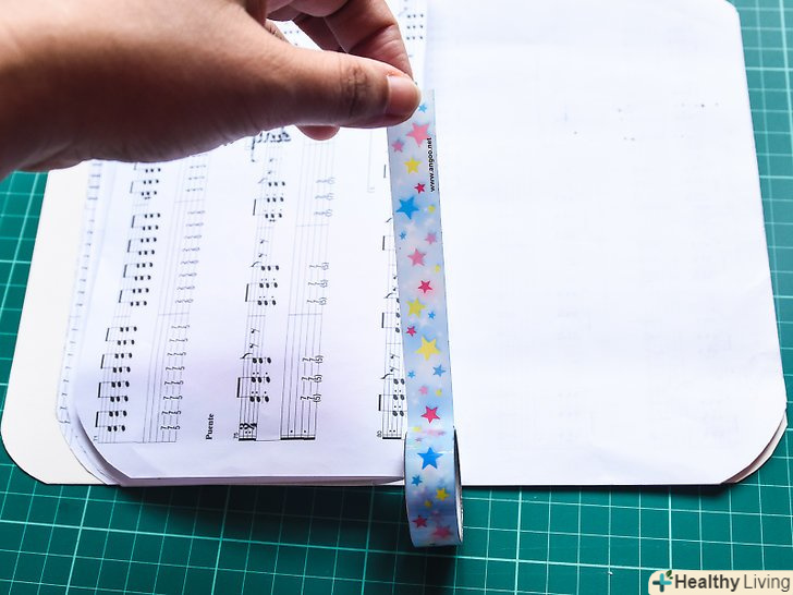 Наклейте декоративний скотч в місцях з'єднання сторінок. цей крок не обов'язковий, але він подарує вашій книзі особливу розкіш. Також він дозволить зміцнити листи. Розкрийте книгу на першій сторінці. Відріжте смужку декоративного скотча довжиною 21 см і наклейте її поверх стику сторінки з обкладинкою. Переверніть аркуш, щоб перейти до наступних сторінок, і повторіть процедуру. Працюйте до тих пір, поки не дійдете до задньої обкладинки. [13]