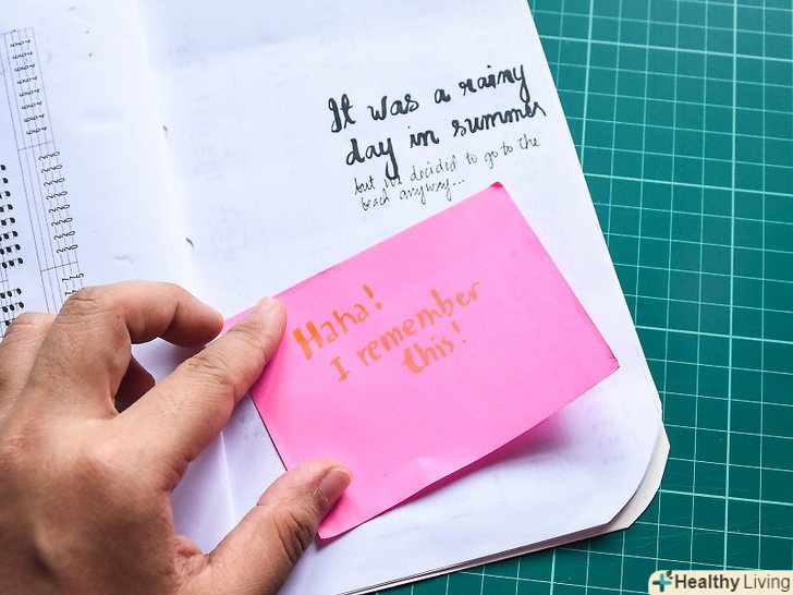 Дозвольте друзям взяти участь у заповненні книги. Покажіть книгу друзям і дозвольте їм що-небудь вписати в неї, немов у випускний шкільний альбом. Якщо до цього ви написали про походи в кіно з певним другом, дозвольте йому прокоментувати вашу запис або доповнити її. Цілком можливо, що в ті дні він помітив щось таке, на що ви не звернули увагу. [18]