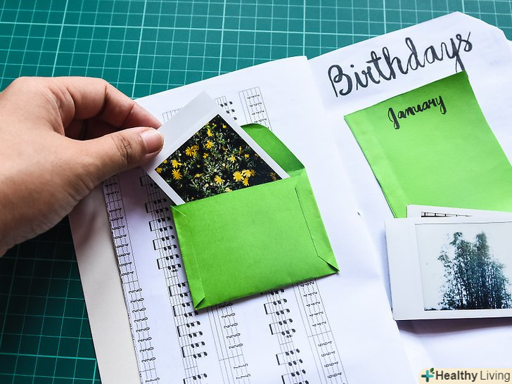 При бажанні для економії простору вклейте в книгу розкриваються Вкладиші. замість того щоб повністю вклеювати фотографії, приклеюйте їх лише по одному краю. Тоді у вас буде можливість відвернути фотографію (немов відкрити дверцята) і описати відповідну подію під нею. Потім покладіть фотографію назад в нормальне положення, щоб приховати напис. [15]