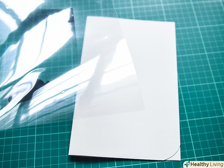 При бажанні захистіть обкладинку листом прозорої плівки. цей крок не обов'язковий , але це допоможе захистити обкладинку книги. Скористайтеся підготовленою паперовою обкладинкою, щоб перенести її контури на лист прозорої плівки, а потім виріжте дублюючу обкладинку з плівки. Складіть плівку поперек навпіл і вкладіть в неї паперову обкладинку. [4]- Прозора плівка являє собою тонкий Безбарвний пластик, який використовується для підготовки демонстраційних матеріалів для проекторів. Таку плівку можна знайти в магазині офісних товарів.