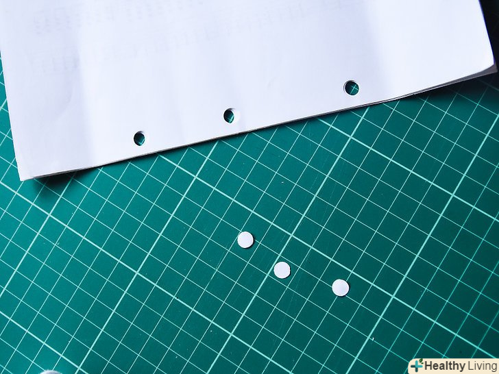Скористайтеся шилом, щоб виконати три отвори в корінці книги. розкрийте ще не скріплену книгу посередині. Візьміть непотрібний рекламний каталог великої товщини і підкладіть його під свою розкриту книгу. Шилом проткніть на згині три рівновіддалених отвори. Перший отвір повинен розташовуватися строго по центру, а два інших — в 2,5–5 см від верхнього і нижнього країв паперу. [7]- Простежте за тим, щоб проткнути шилом всі сторінки і обкладинку книги.