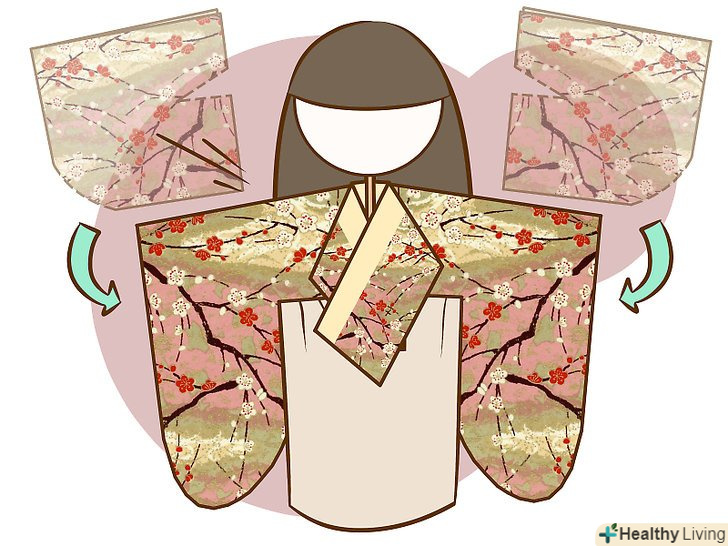 Повторіть процедуру з правою стороною. загніть правий кут кімоно по діагоналі вперед. Загніть всю праву сторону до центру.- При загинанні правого кута проминайте тільки самий верх згину.