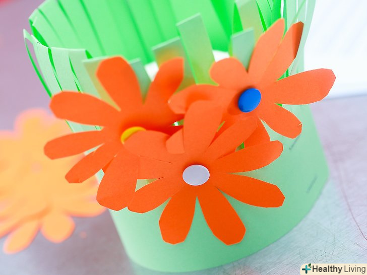 Прикріпіть квітки до стебел. за допомогою клею або скотча прикріпіть зроблені квітки до товстих смужок, вирізаним вами на зеленій підставці (стеблах).