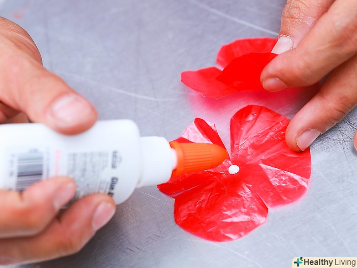 Склейте пелюстки. капніть клеєм на центральну частину однієї пелюстки і приклейте до нього другий, розвівши їх в сторони. Склейте так шість пелюсток разом, щоб квітка був пишним і якомога більше був схожий на справжній.