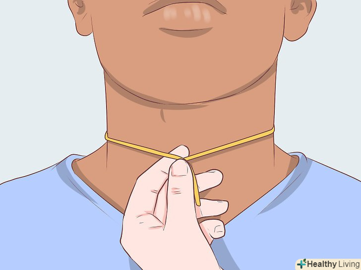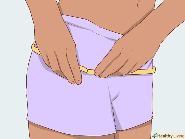 Визначте обхват талії. Візьміть вимірювальний матеріал і визначте обхват природної талії – найвужчого місця тіла. Щоб визначити місце розташування талії, погляньте в дзеркало і зверніть увагу на ту ділянку тіла, який знаходиться трохи вище пупка, але нижче грудної клітини. [5]- Зауважте, що існує різниця між природною лінією талії і лінією талії пояса брюк, спідниць або шортів. Коли в розмірі одягу вказано розмір талії, зазвичай під ним розуміється розмір самої вузької частини тіла, тобто природної талії. Якщо ж ви хочете носити конкретний предмет одягу нижче природної лінії талії, то ви можете зняти додаткову мірку в тому місці.