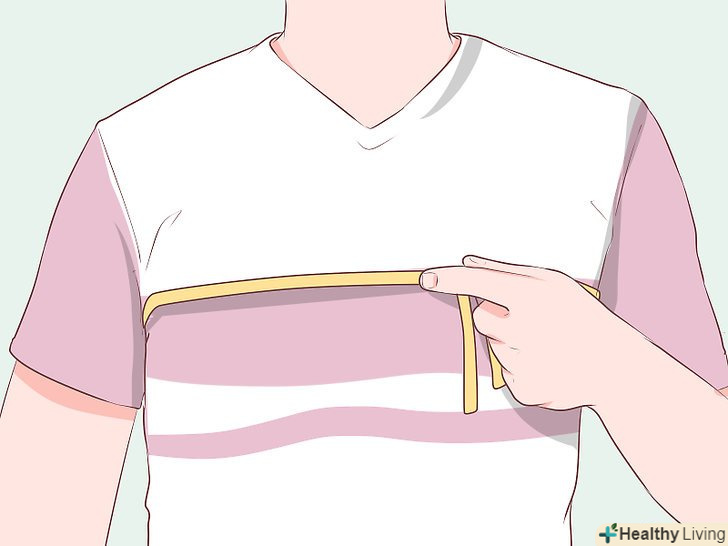 Визначте обхват грудей. щоб виміряти обхват грудей, необхідно провести вимірювальний матеріал навколо тіла по лопатках, під пахвами і по самій виступаючої частини грудей.- Груди не повинна бути випнутою або втягнутою, людина повинна перебувати в комфортному, розслабленому стані. Мірка знімається під час видиху щільно прилеглим до тіла вимірювальним матеріалом.