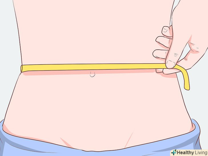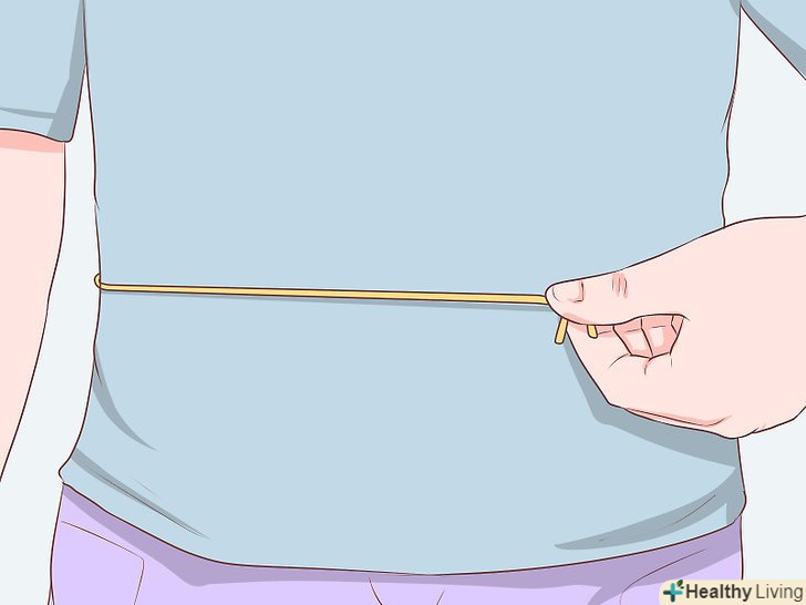 Визначте обхват талії. щоб дізнатися обхват талії, потрібно обхопити тіло вимірювальним матеріалом трохи вище пупка.- Під час зняття мірки необхідно розслабитися і видихнути. Не слід випинати або втягувати живіт. Якщо ви знімаєте мірку з іншої людини, не забудьте його проінструктувати.