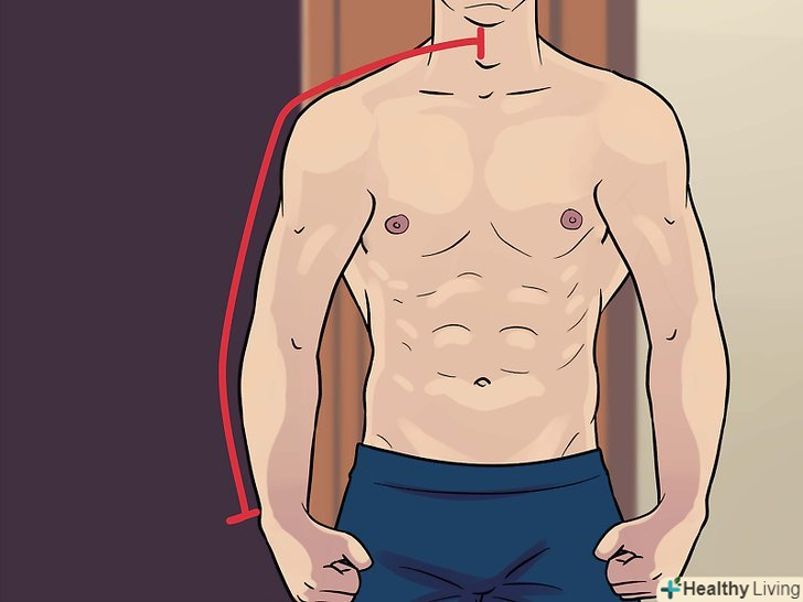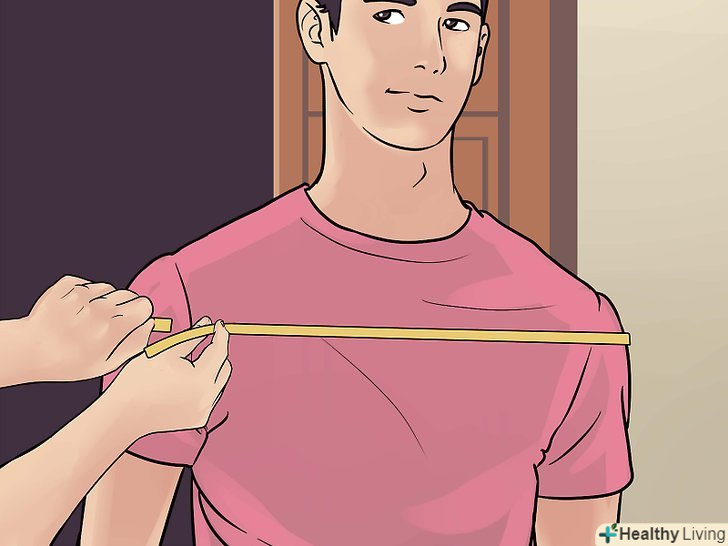 Виміряйте ширину плечей. витягніть руки по швах і оберніть стрічку навколо грудей і обох плечей, трохи нижче ключиці. Пальцем намацайте виступаючу частину ключиці і зніміть мірки нижче цього місця.