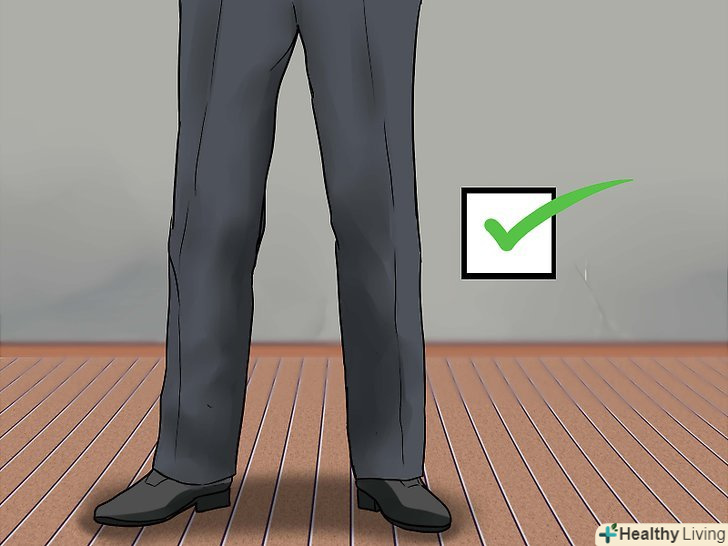Переконайтеся, що штани правильної довжини. одягніть взуття і перевірте довжину штанів. Вони повинні бути підрубані рівномірно з задньою частиною каблука вашого взуття, злегка лягаючи на передню частину взуття. Вони не повинні драпірувати занадто багато або висіти над взуттям, а лише розділяти верхню і нижню частину взуття.