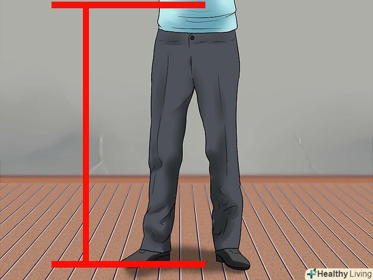 Виміряйте зовнішній шов. зовнішній шов-це шов, який йде по зовнішній стороні вашої ноги. Цю мірку потрібно знімати у взутті. Виміряйте відстань від зовнішнього склепіння взуття, піднімаючи стрічку вище ноги, повз стегнової кістки до висоти пупка. Ця мірка визначає висоту брюк.- Переконайтеся, щоб взуття було такої ж висоти, що і та, яку ви будете носити під смокінг. Не варто знімати мірки босоніж або у високих ковбойських черевиках.