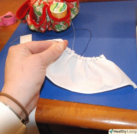 Прошийте однаковими стібками, довжина стібка приблизно 1/4 дюйма (0,5 см) по кромці тканини, яку будете збирати в оборки. акуратно потягніть, щоб матеріал зібрався невеликими хвилями/складками в сторону вузлика на кінці нитки. Коли вся тканина буде "зібрана" на необхідну вам довжину, зав'яжіть нитку.