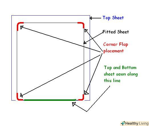 - Подивіться на схему. простирадла для водяних ліжок відрізняються від звичайних простирадл двома моментами. По-перше, вони мають куточки (відзначені червоним), які допомагають заправляти ліжко, по-друге, простирадла зшиваються з верхньої і нижньої частини (місце зшивання відзначено зеленою лінією).