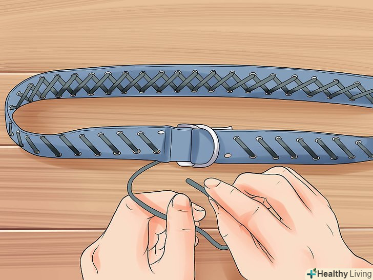 Додайте шнурівку, як у корсета. якщо хочете ускладнити роботу, спробуйте додати своєму ременю перехресну шнурівку на зразок корсетної. Це можна зробити кількома способами. Найпростіше буде виконати отвори уздовж верхньої і нижньої меж ременя і вплести через них довгу декоративну мотузку або стрічку хрест-навхрест. Проте, є й інші варіанти: якщо ви впевнені в своїх швейних здібностях, можете навіть обрізати ремінь ззаду і пришити справжні корсетні фіксатори. [8]- Для отримання довідки про основні правила при створенні корсета ознайомтеся з нашими статтями з виготовлення корсета і корсетного браслета.