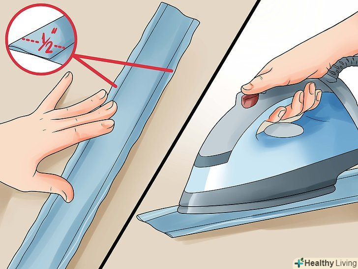 Складіть краю і пропрасуйте їх. зупинивши стійку на певній тканині, розкладіть її в довжину на робочому місці (щоб вона лежала зліва направо), візерунчастою стороною вниз. Загніть лівий і правий край тканини десь на 1,27 см.пропрасуйте їх гарячою праскою. Візьміть голку і нитку або швейну машинку, щоб зшити ці складки, залишивши запас шва приблизно 0,76 см.- Це робиться для того, щоб в готовому виробі не було видно краю тканини. Базове правило шиття-відкриті краї тканини зношуються набагато швидше, ніж складені шви, тому їх варто уникати за всяку ціну.