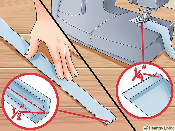 Складіть тканину навпіл і зшийте разом. далі загніть верхній і нижній краї тканини на 1,27 см і випрасуйте їх тим же чином, що і лівий і правий краї. Потім складіть всю тканину навпіл в довжину, щоб вона мала вигляд довгої худої смуги (Візерункова сторона тепер повинна бути обличчям до вас). Розгладьте отриману смугу, а потім зшийте нижній і верхній (складений) край, залишивши запас шва шириною 0,63 см.