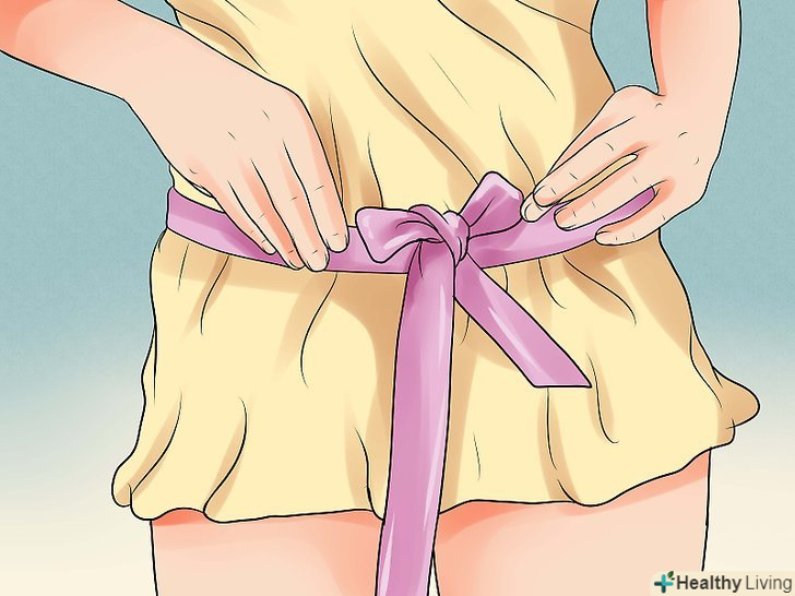 Обв'яжіть навколо талії. на даному етапі ваш ремінь буде більш-менш готовим. З огляду на простий стиль ременя, вам потрібно лише закріпити його навколо талії і спокійно носити. Якщо хочете, можете навіть прив'язати декоративний вузол або бантик навколо талії для додаткового шику!- Якщо вас турбують відкриті краї на обох кінцях ременя, можете зшити їх разом так само, як зшивали раніше краю тканини.
