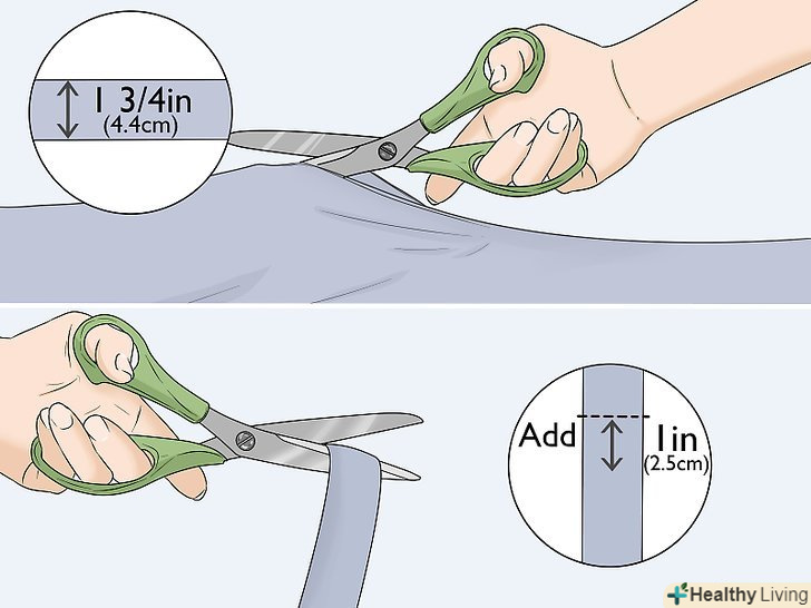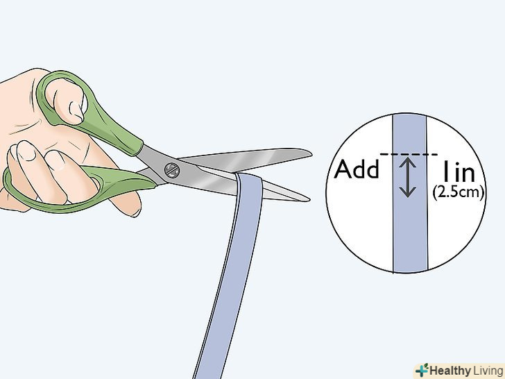 Викроїте смужку тканини на 2,5 см довше, ніж талія сукні. розкладіть на робочій поверхні відріз тканини в тон вашому сукні і довжиною близько 0,6–1,2 м.потім викроїте з нього смугу тканини шириною близько 4,5 см і на 2,5 см довше, ніж окружність сукні в талії. [8]- Наприклад, якщо окружність сукні становить 96,5 см, викроїте смугу тканини довжиною 99 см і шириною 4,5 см.