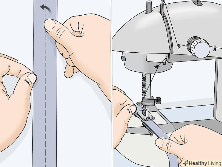 Складіть смужку уздовж навпіл і прокладіть поздовжній шов з припуском 5 мм. складіть тканину таким чином, щоб її лицьова сторона виявилася всередині. Потім скористайтеся швейною машиною і прокладіть уздовж поздовжніх зрізів пряму строчку. Використовуйте припуск шириною 5 мм. рядок не повинна доходити до кінців смуги приблизно по 5 см.- Для полегшення процесу шиття спробуйте попередньо пропрасувати складену смужку, щоб вона лежала рівно.