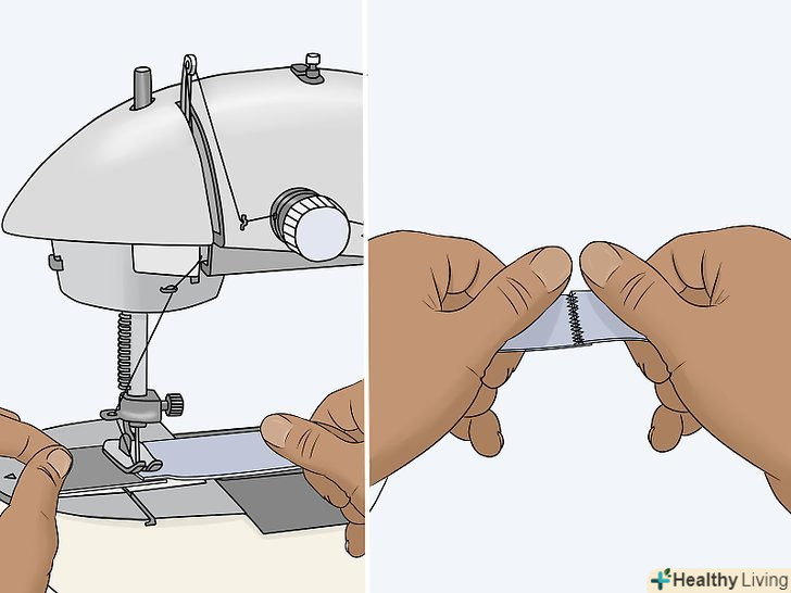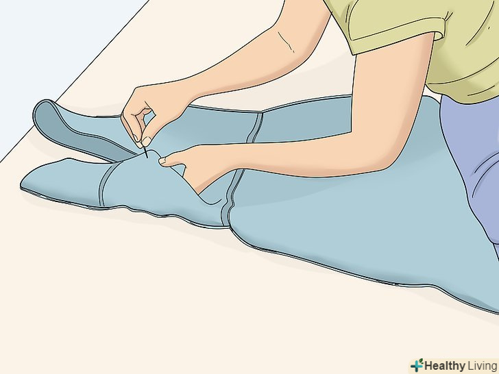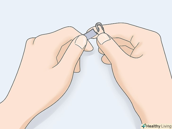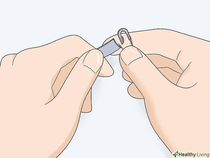 Причепіть до кінця гумки англійську шпильку і протягніть гумку в кулиску. з англійської шпилькою вам буде простіше протягнути гумку в кулиску. Продовжуйте проштовхувати шпильку через кулиску до тих пір, поки повністю не вденете гумку в кулиску. [13]- Щоб вільний кінець гумки не вислизнув в кулиску, його можна тимчасово приколоти до тканини зовні кулиски.