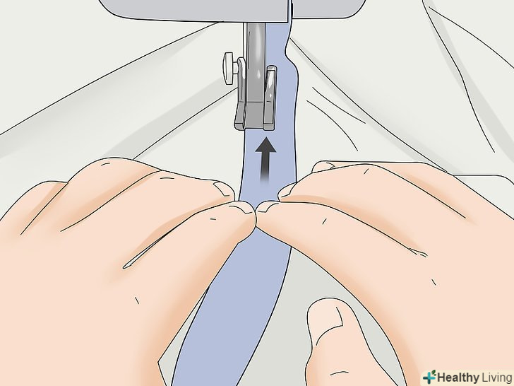 Настрочіть кулиску в край по її верхньому і нижньому краях на талію сукні. для виконання строчки в край можна використовувати стандартну лапку швейної машини. Просто прокладіть по рядку з відступом 1-2 мм від верхнього і нижнього країв кулиски. Прокладайте рядки по колу талії, в кінці обов'язково залиште незастроченное отвір (на спочатку незастроченном ділянці трубки) розміром близько 5 сантиметрів, щоб у вас була можливість вставити в кулиску гумку. [11]- При наявності спеціальної лапки для виконання рядків в край, скористайтеся такою лапкою. Дана лапка допоможе вам направляти тканину таким чином, щоб рядок лягала рівно по краю кулиски.