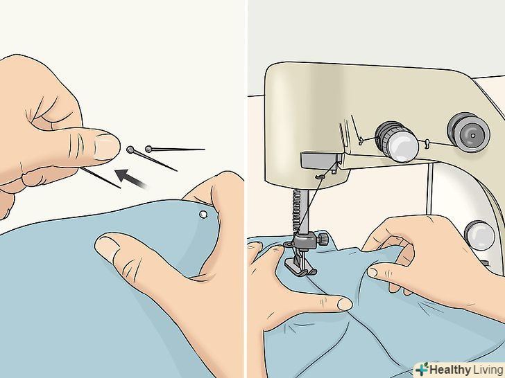 Прокладіть пряму рядок уздовж накреслених ліній. скористайтеся швейною машиною , заправленої нитками в тон сукні, щоб прокласти на ньому два нових бічних шва. По ходу роботи поступово виймайте шпильки з тканини, щоб вони не потрапили під машинну голку. [3]- Плаття можна вшити і вручну, проте Машинна строчка буде міцніше, а її стібки — однаковими.