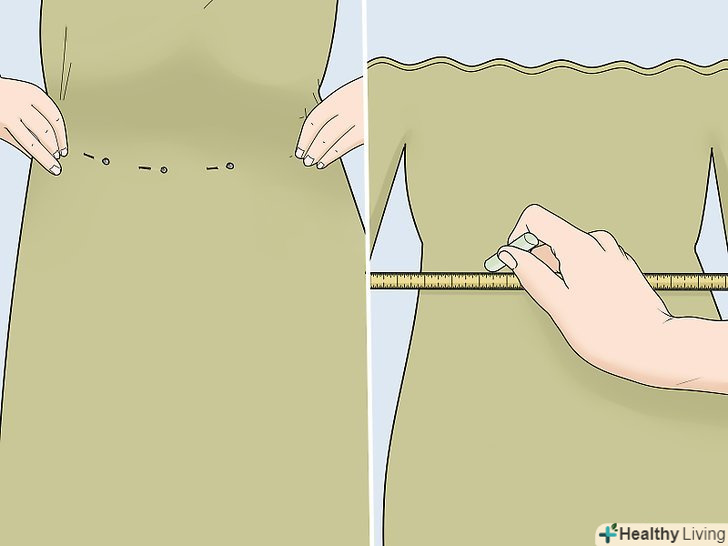 Розкладіть плаття на столі іВиміряйте його повну окружність в талії . Візьміть сантиметрову стрічку і виміряйте окружність сукні в талії по наміченої раніше лінії. [7]- Дуже важливо використовувати саме результати власного вимірювання, а не орієнтуватися на розмірні таблиці. Розмірні таблиці одягу, що включають в себе вказівку талії, можуть сильно різнитися з фактичними розмірами вироби.